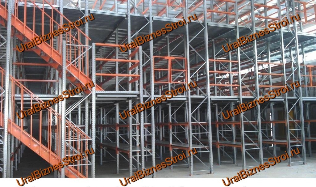 Устанавливается на рамах стеллажа, служащих базой полочных или паллетных стеллажей. При отдельной установке платформы она выполнена в формате полноценного уровня, а на него помещаются стеллажи для расстановки определенных грузов. Пол этажа застилается металлической решеткой, П-образный профиль или профилированными листами, фанерой.